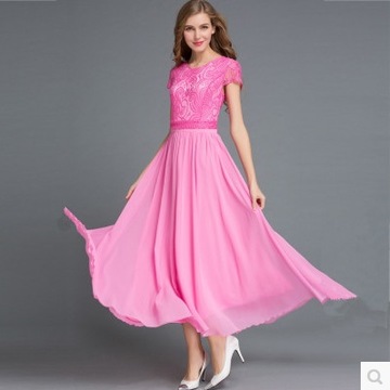 2016夏季新款女裝波西米亞雪紡拼接蕾絲圓領(lǐng)短袖大擺連衣裙長(zhǎng)裙子 /