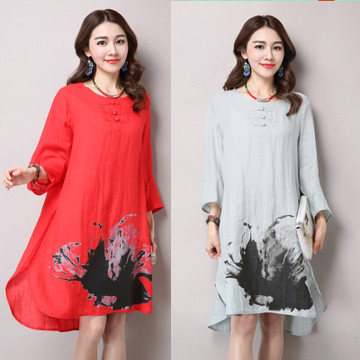 2016夏新款大碼中國民族風(fēng)水墨印花七分袖中長款連身裙 /