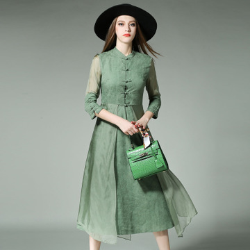 韓版2016春夏新款文藝復(fù)古真絲印花不規(guī)則裙立領(lǐng)七分袖連衣裙女 /