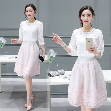 韓版2016夏季新款淑女圓領(lǐng)中袖上衣+歐根紗繡花中裙兩件套連衣裙 /