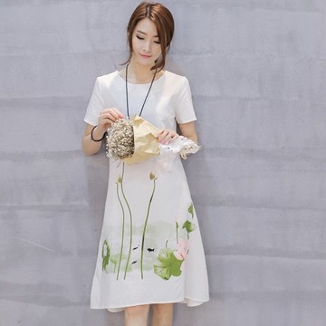 實拍2016夏新款文藝范棉麻大碼女裝印花連衣裙寬松A字背心裙 /