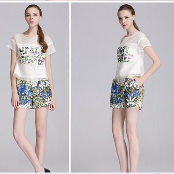 2016歐美時尚優(yōu)質(zhì)大碼女裝鏤空網(wǎng)紗圓領(lǐng)短袖T恤+印花短款兩件套裝 /