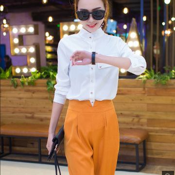 韓版時尚新款女裝OL氣質(zhì)立領(lǐng)單排扣長袖襯衫+高腰顯瘦長褲兩件套 /