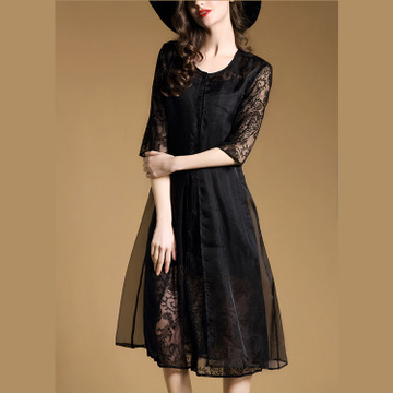 2016EBAY速賣通夏季新品高端桑蠶絲修身連衣裙仿絲假兩件中長(zhǎng)裙 /