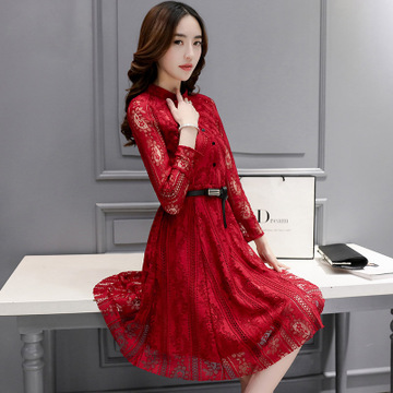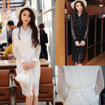 韓國2016春夏新款長袖打底裙子中長款蕾絲連衣裙度假長裙假兩件 /