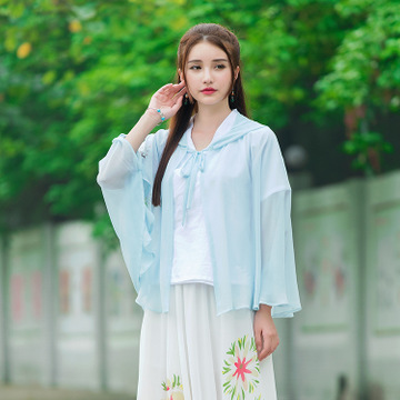 2016手繪漢服元素斗蓬披風(fēng)夏季 薄款防曬連帽系帶中式開衫外套女 /