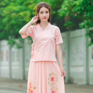 中式交領(lǐng)棉麻系帶改良古裝漢服女 2016夏季純色短袖開衫上衣代發(fā) /