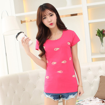 2016夏裝新款魚刺印花短袖T恤女韓版修身白色打底衫中長款體恤潮 /