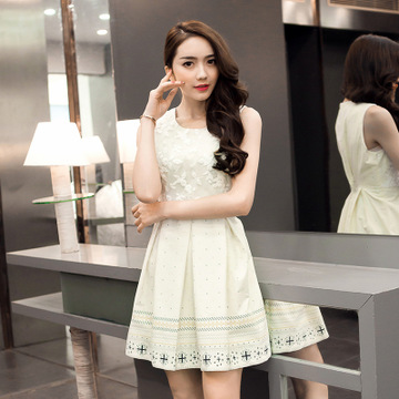 2016夏季新款時尚無袖蕾絲連衣裙夏韓版歐根紗顯瘦印花a字裙子女 /