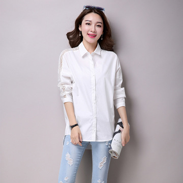 純色翻領(lǐng)長袖精致鏤空不規(guī)則女式白襯衫 韓版春季潮流新款女裝 /