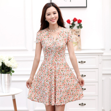 修身時尚v領(lǐng)短袖精致小碎花女式中長款連衣裙 甜美新品女裝 批發(fā) /