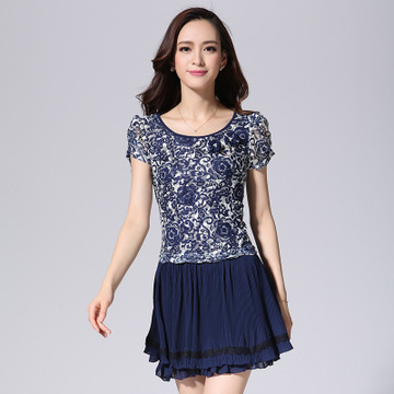 潮流時尚圓領(lǐng)短袖拼接印花中長款連衣裙 2016寬松大碼精品女裝 /