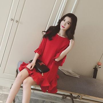 2016春裝新款韓版百褶雪紡連衣裙七分喇叭袖寬松網(wǎng)紗拼接短 /