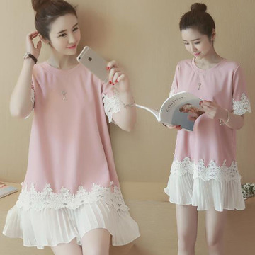 2016春新款女裝韓版鉤花花邊拼百褶荷葉邊顯瘦連衣裙 /