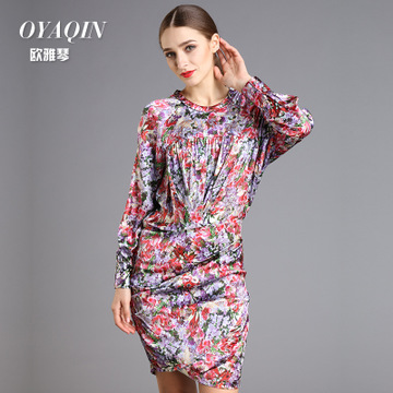 OYAQIN 2016真絲春裝新款女裝印花連衣裙 /