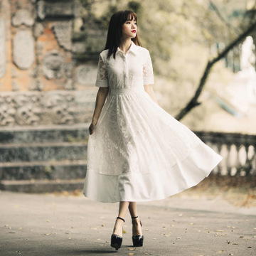 范冰冰同款2016 蕾絲襯衫領(lǐng)連衣裙 復(fù)古文藝 夏 女 白 仙女裙子 /