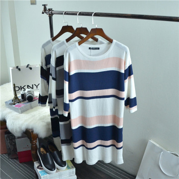 • 橫條紋彩條拼接撞色寬松款五分袖中長針織衫  一件代發(fā) /