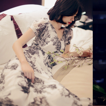 2016夏裝新款韓牌名媛氣質(zhì)修身印花雪紡連衣裙開叉飄逸大擺長(zhǎng)裙 /