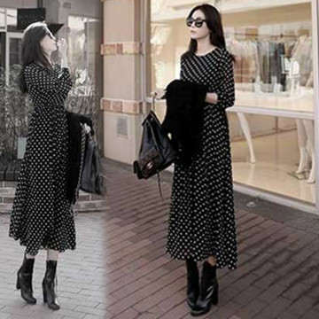 2016春季雪紡連衣裙長(zhǎng)袖韓版中長(zhǎng)款波點(diǎn)顯瘦打底裙波西米亞長(zhǎng)裙 /
