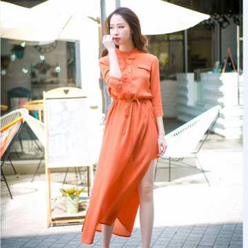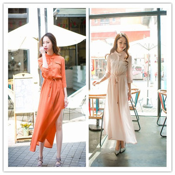 2016春夏新款連衣裙韓版優(yōu)雅時(shí)尚性感高開叉修身小立領(lǐng)飄逸長(zhǎng)裙女 /