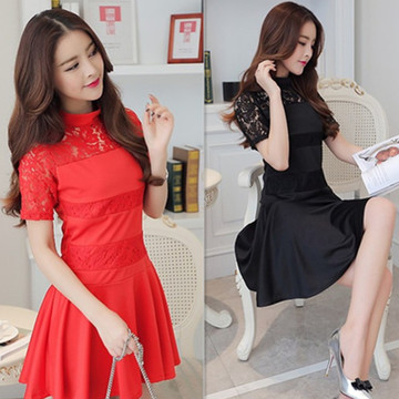 2016夏裝新款韓版大碼雪紡短袖連衣裙女蕾絲拼接修身連衣裙東大門 /