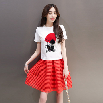 2016夏季新款清新甜美套裝裙女裝時(shí)尚印花短袖顯瘦兩件套連衣裙 /