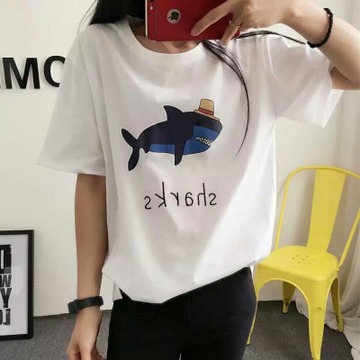 青島女裝貨源批發(fā) 純棉卡通鱷魚印花白色短袖寬松版打底衫t恤上衣 /