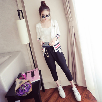 2016春夏新品韓版撞色條紋V領(lǐng)單排扣九分袖短外套開衫女 /
