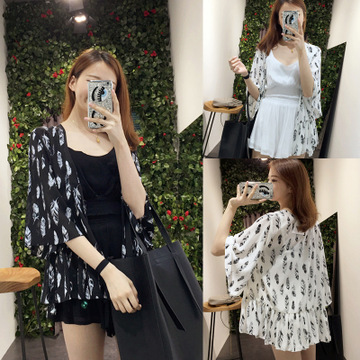 2016夏季新款韓版褶皺下擺羽毛雪紡開衫防曬衫防曬衣外套披肩 /