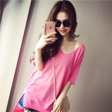 2016夏季新品韓版V領(lǐng)純色針織顯瘦中長款寬松T恤女上衣潮D127 /