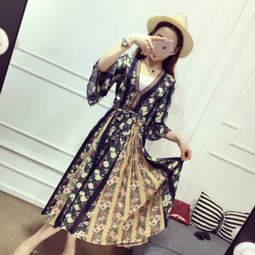 2016夏季韓版復(fù)古民族風(fēng)V領(lǐng)喇叭袖撞色花朵百褶雪紡連衣裙女 /