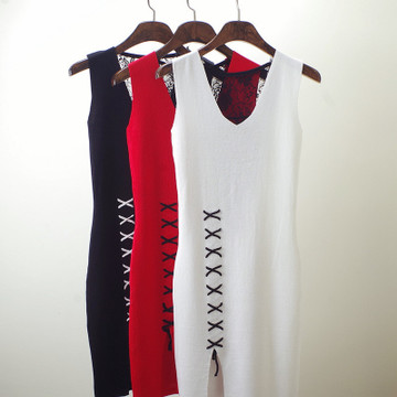 2016夏季新款純色修身曲珠連衣裙蕾絲紗網(wǎng)中長(zhǎng)款針織衫套頭連衣裙 /