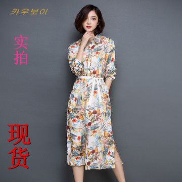 現(xiàn)貨2016春秋歐美新款大碼修身顯瘦中長款長袖印花雪紡連衣 /