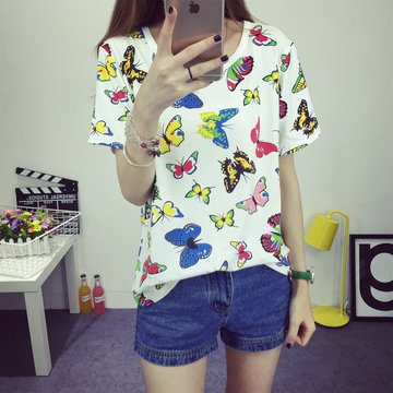 2016新款卡通印花蝴蝶短袖T恤女圓領(lǐng)純棉可愛女夏短T熱賣爆款批發(fā) /