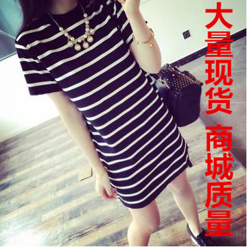 2016熱賣批發(fā)中長(zhǎng)款女式條紋寬松T恤韓版橫條紋側(cè)開叉長(zhǎng)款短袖T恤 /