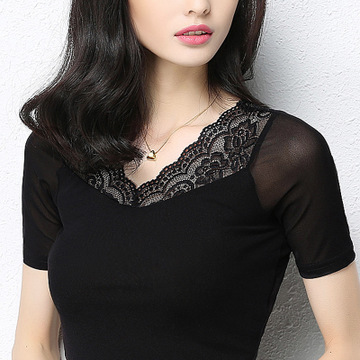 2016春夏新款T恤V領(lǐng)蕾絲拼接短袖性感大碼胖mm網(wǎng)紗打底衫女小衫潮 /