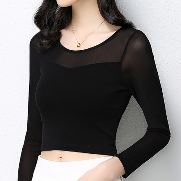 2016春夏新款半截網(wǎng)紗打底衫短款露腰露肚臍性感上衣女T恤潮 /