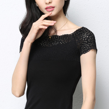 2016春裝新款莫代爾蕾絲拼接一字領(lǐng)短袖T恤女修身打底衫潮秋 /