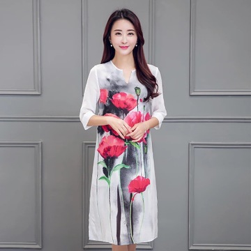 2016春夏新款絲麻水墨荷花印花旗袍式連衣裙立領(lǐng)中袖中長款A(yù)字裙 /