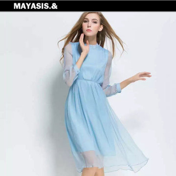 16年南油春夏高端真絲順宇縐料顯瘦飄逸中袖長裙修身品質(zhì)連衣裙 /
