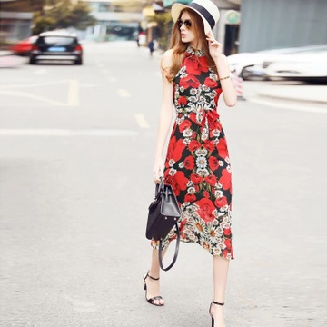 歐美2016夏季新品性感女神范露肩中長款A(yù)字裙 印花系帶修身連衣裙 /