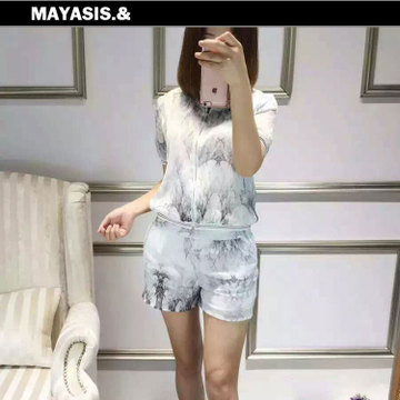 16年歐洲站南油春夏重工質(zhì)感水墨印花絲麻復(fù)古文藝休閑套裝短褲 /