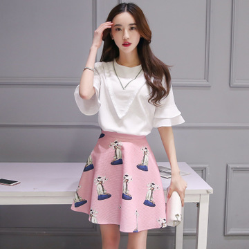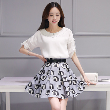2016夏季女甜美套裝裙修身連衣裙短袖雪紡衫上衣印花短裙子兩件套 /