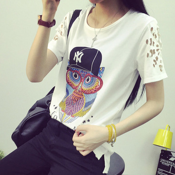 貓頭鷹印花鏤空純棉短袖T恤女夏裝韓版寬松前長(zhǎng)后短開(kāi)叉學(xué)院風(fēng)棉 /