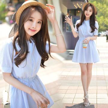 2016夏季新款女裝純棉麻短袖條紋襯衫裙 中長款甜美連衣裙子 /