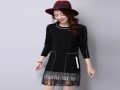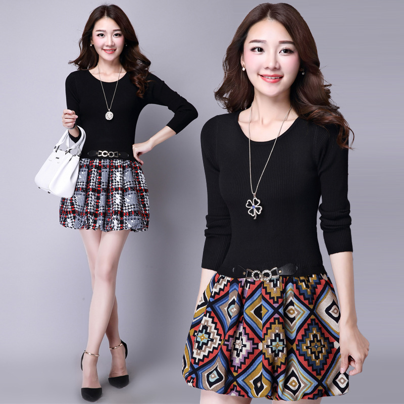 最新款秋裝女 時尚修身打底針織衫裙 圓領(lǐng)拼接雪紡中長款毛衣裙 /