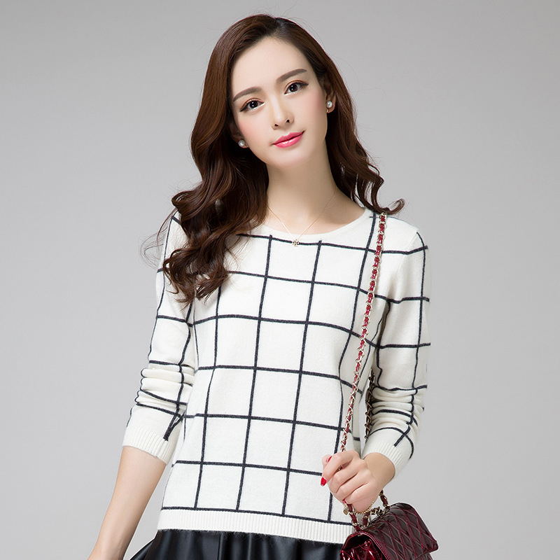 2015冬季新款女裝羊毛衫韓版女式貂絨衫圓領(lǐng)格紋撞色套頭毛衣女 /