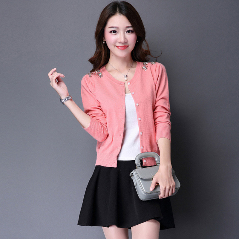 韓版女裝2015秋季新發(fā)針織開衫女款手工釘珠寬松圓領(lǐng)針織小外套女 /