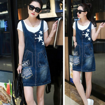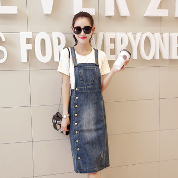 實(shí)拍2016夏新款韓版休閑學(xué)生牛仔背帶裙中長款連衣裙破洞背心 /