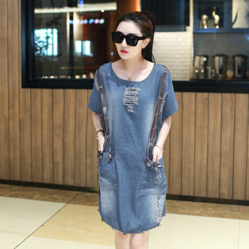 實(shí)拍歐美2016夏季新款大碼休閑連衣裙女裝破洞短袖薄牛仔背帶 /